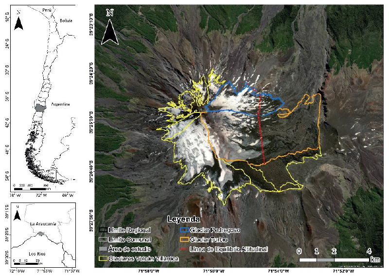 El área de estudio (Figura 1) comprende los glaciares Pedregoso (2,85 km²) y Turbio (10,41 km²) del Volcán Villarrica (39,42° S/71,93° O; 2.847 m.s.n.m.); localizado en el rango latitudinal de la Zona Glaciológica Sur (36-46° S), Chile (DGA, 2011; DGA, 2022).