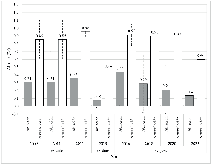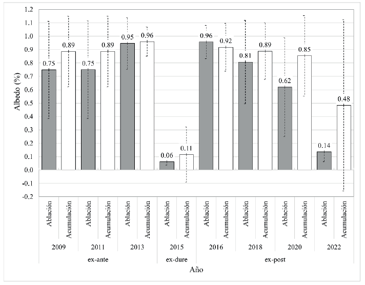 Figura 4 Promedio y desviación estándar del albedo del Glaciar Pedregoso, para sus zonas de ablación y acumulación, antes (ex-ante), durante (ex-dure) y después (ex-post) del evento eruptivo.