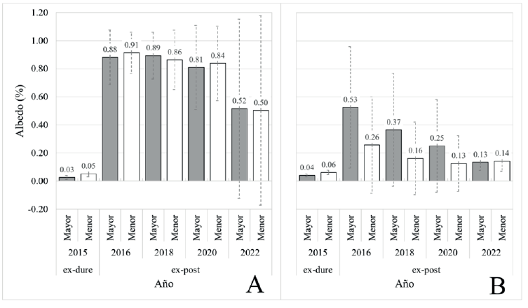 La Tabla 3 da cuenta de la magnitud de cambio temporal entre el albedo previo al evento eruptivo (resultante de promediar sus valores en 2009, 2011 y 2013) y aquel correspondiente a la fecha más reciente (2022), para las zonas de ablación y acumulación de ambos glaciares estudiados. Cabe notar que el albedo del Glaciar Turbio mostró una diminución menos acentuada que el del Glaciar Pedregoso, particularmente en su zona de ablación (0,13).