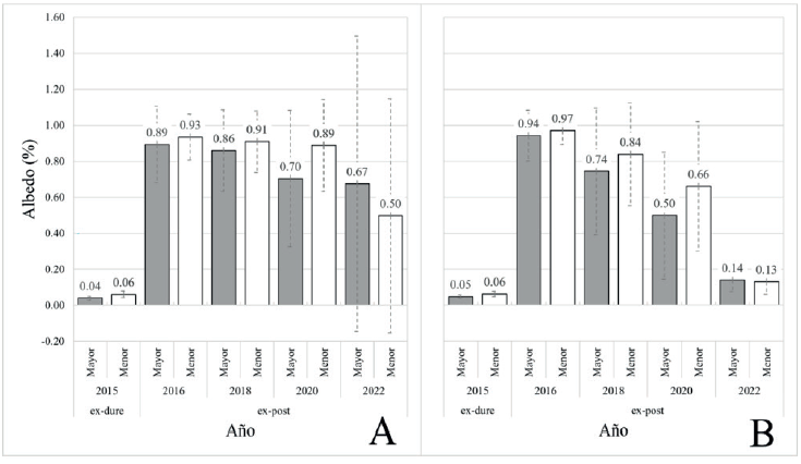 Si bien el albedo de ambos glaciares estudiados reestablece sus valores ex-ante tras un año de ocurrido el evento eruptivo de 2015, su comportamiento a lo largo de las restantes fechas ex-post (2017-2022) es tendiente a la baja, especialmente en sus zonas de ablación. Dicho hallazgo es atribuible a la exposición progresiva en el tiempo de las tefras depositadas en el sustrato de hielo, debido a la fusión/sublimación cíclica que experimenta durante el estío la capa nival que logra recubrirlas durante el resto del año, intensificando así su improntación en el sustrato de hielo, en respuesta a su relativamente alta absorción y subsecuente emisión de radiación incidente, propiciando el derretimiento de la nieve/hielo que las circunda, proceso que se acentuará particularmente bajo la ELA. Por otro lado, de acuerdo con He (2022), una amalgama de nieve y sedimentos tanto microscópicos como macroscópicos, redundará en un incremento en la regularidad y tamaño de los granos que componen al sustrato nival, favoreciendo esto la penetración de radiación y, por ende, su disponibilidad para ser absorbida, reduciendo así el albedo de dicho sustrato e incrementando su ablación.