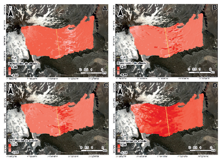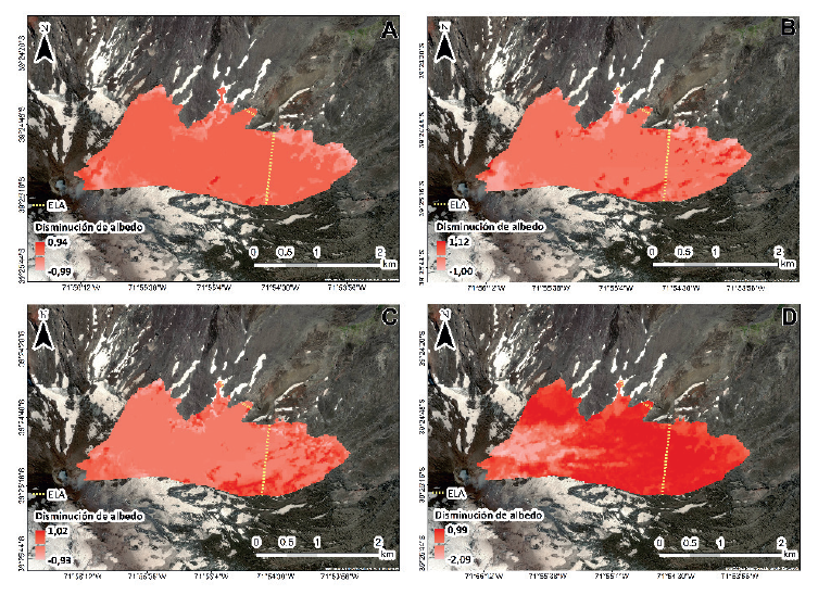 Figura 6 Mapeo de las diferencias entre el albedo del Glaciar Turbio previo al evento eruptivo (resultante de promediar sus valores en 2009, 2011 y 2013) y el de cada una de sus fechas posteriores: 2016 (A), 2018 (B), 2020 (C) y 2022 (D).
