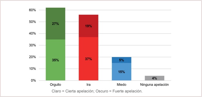 Por un lado, con respecto a los tipos de emociones, hay dos factores principales que determinan el uso de un tipo u otro de emoción: si el partido se encuentra en el poder y su situación en las encuestas. A nivel general, los candidatos líderes en las encuestas tienden a emplear con mayor proporción apelaciones a la ira y el orgullo buscando apelar a su base ya existente de votantes (Ridout y Searles, 2011): en el caso de estar en el poder suelen primar las apelaciones al orgullo; mientras que en aquellos en la oposición lo hacen las apelaciones a la ira (Mayer y Nguyen, 2021, 2021). En lo que respecta a los candidatos rezagados en las encuestas, son más propensos a utilizar apelaciones al miedo (Ridout y Searles, 2011), especialmente si se encuentran en el poder (Crespo-Martínez et al., 2022).