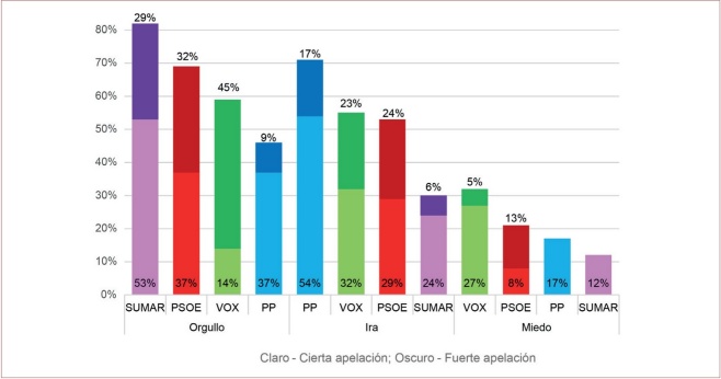 Al analizar las diferencias entre partidos, tal y como quedan recogidas en la Figura 2, se observa que tanto PP como VOX emplearon un mayor porcentaje de apelaciones a la ira (54% con cierta apelación y 17% con fuerte el PP, y 32% con cierta apelación y 23% con fuerte VOX) que el PSOE (29% con cierta apelación y 24% con fuerte) y Sumar (24% con cierta apelación y 6% con fuerte). Sin embargo, en lo referente al orgullo, PSOE (37% con cierta apelación y 32% con fuerte) y Sumar (53% con cierta apelación y 29% con fuerte) realizan con mayor frecuencia apelaciones que PP (37% con cierta apelación y 9% con fuerte) y VOX (14% con cierta apelación y 45% con fuerte), si bien este último partido es el que más ha realizado, en proporción, apelaciones fuertes al orgullo. Con respecto al miedo, VOX fue el partido con mayor proporción de apelaciones (27% con cierta apelación y 5% con fuerte), si bien el PSOE realizó más apelaciones intensas (8٪ con cierta apelación y 13٪ con fuerte), mientras que PP y Sumar no realizaron fuertes apelaciones al miedo (17% de cierta apelación el PP y 12% Sumar).
