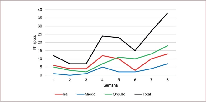La evolución en el tiempo queda recogida en la Figura 3. En la primera semana se emitieron doce spots en total (seis apelando a la ira, cinco al orgullo y uno al miedo), mientras que las dos semanas siguientes se redujeron a siete por semana. En las semanas 4 y 5 se emitió un mayor número de spots, en concreto 24 en la semana 4 (doce apelando a la ira, siete al orgullo y cinco al miedo) y 23 en la 5 (diez apelando a la ira, once al orgullo y dos al miedo). Por último, tras bajar a 15 en la semana 6, se observa cómo en las dos semanas oficiales de campaña (7 y 8), es donde más se concentró el número total de spots. En la semana 7 se emitieron 27, con diez que apelaban a la ira, trece al orgullo y cuatro al miedo, mientras que en la 8 se emitieron 38 spots con trece apelando a la ira, 18 al orgullo y siete al miedo.