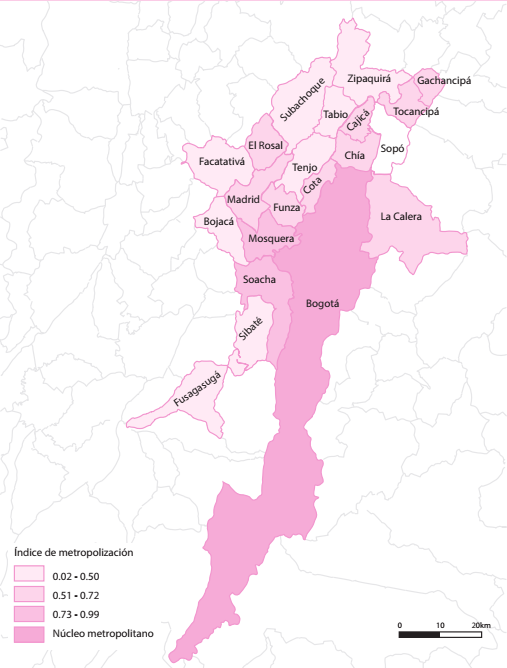 Por metrópoli se entiende un núcleo metropolitano, en este caso Bogotá, y el conjunto de jurisdicciones con las que sostiene relaciones de metropolización, que se profundizan y ensanchan de manera paulatina en el marco de un proceso de poblamiento desequilibrado del país, en el que estas configuraciones espaciales se encuentran a la cabeza de la jerarquía del sistema urbano. Las relaciones de metropolización estructurales se captan en la intensidad de los movimientos de población de toda la vida que distinguen entre el lugar de nacimiento y el lugar de residencia habitual de las personas, de los que resultan saldos migratorios de signo positivo en las jurisdicciones diferentes del núcleo. Los cambios de lugar de residencia permanente ocasionan la progresiva integración de los mercados habitacionales, a los que les sucede la del mercado de trabajo; estos últimos generalmente van acompañados de la relocalización de establecimientos industriales, comerciales y de servicios otrora localizados en el núcleo en dirección de las jurisdicciones involucradas en el proceso de metropolización.