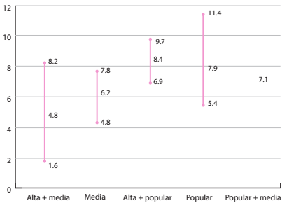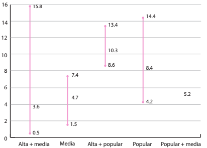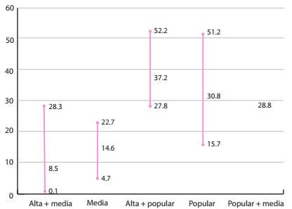 El segundo rasgo es que los valores promedio y, en general, el límite superior del intervalo de cada variable es más elevado en los vecindarios populares aun si hay mezcla social; es decir, que la contribución de las proximidades entre clases sociales a la resolución de los problemas laborales de los pobres es muy limitada y, en ocasiones, puede hasta agravarlos. Cuando la clase media se mezcla con la clase alta, el rango se amplía; pero la tasa de desempleo promedio se reduce, mientras que cuando la clase popular lo hace, se encoje el rango, pero el promedio es más elevado que cuando no hay mezcla (véase Gráfica 1).