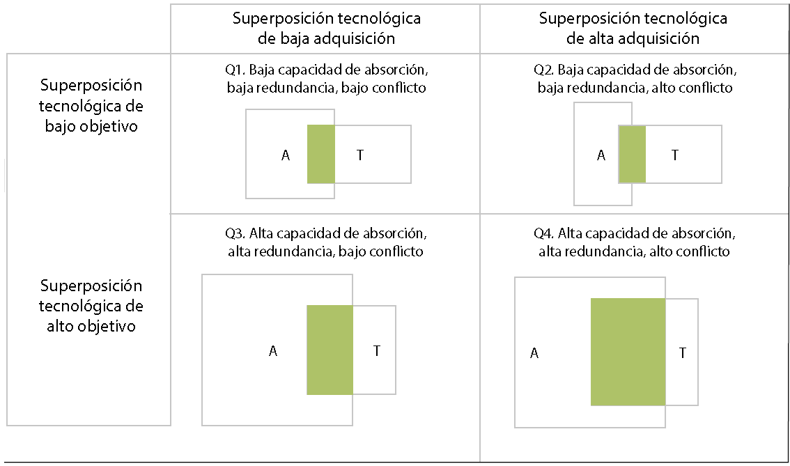 La siguiente matriz, propuesta por Sears y Hoetker (2013), muestra las distintas combinaciones que se presentan en el traslape tecnológico. Los cuadros A representan la base de conocimiento tecnológico del adquiriente (con la que cuenta cada empresa), y la parte sombreada se refiere al traslape tecnológico. Los cuadros T representan la base de conocimiento tecnológico del objetivo.