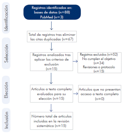 Una vez realizada la búsqueda según los términos expuestos se obtuvieron 346 artículos, y tras eliminar los trabajos duplicados un total de 91. Se establecieron unos criterios de selección para filtrar los resultados, dejando solo los adecuados para esta revisión. En cuanto a los criterios de inclusión, solo se incluirán aquellos trabajos en inglés o español que hayan sido publicados en los últimos 5 años (2015-2020) con el fin de recabar la literatura científica más actual, que en el caso de la neurología se encuentra en constante cambio y evolución. Como criterios de exclusión, se eliminarán aquellos trabajos que sean revisiones o protocolos, que no se ajusten al objetivo del trabajo o que aparezcan repetidos en las bases de datos. El proceso de selección de los artículos, desde la búsqueda hasta la selección final, se muestra en la Figura 1 mediante un diagrama de flujo acorde con las directrices PRISMA.