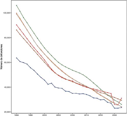 Se excluyeron del análisis estatal las defunciones ocurridas y registradas en el extranjero y sin información del año de defunción. De 1992 a 2022, las defunciones excluidas representaron 0.09 % del total registrado.