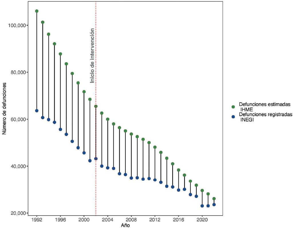 Figura 2 Brecha entre defunciones registradas y estimadas de menores de cinco años en el ámbito nacional de 1992 a 2022. La línea punteada marca el inicio de la “búsqueda intencionada de defunciones infantiles” en 2002. Fuentes: Instituto Nacional de Estadística, Geografía e Informática (INEGI), estadísticas de defunciones registradas, 1992-2022; Institute for Health Metrics and Evaluation (IHME), estimaciones publicadas en 2024.