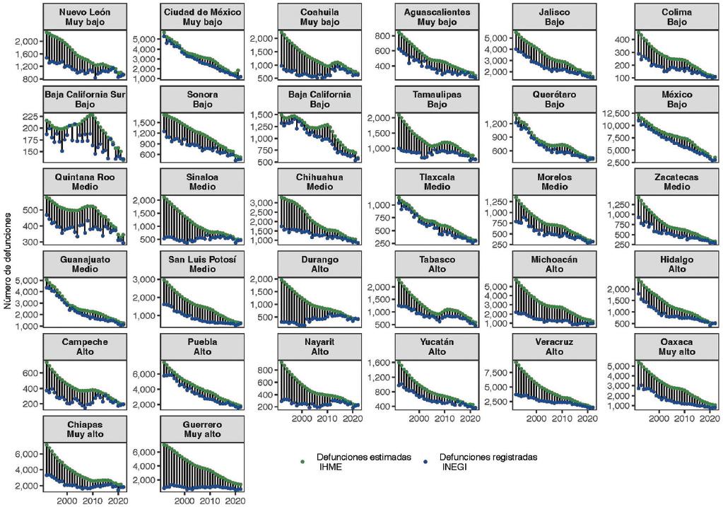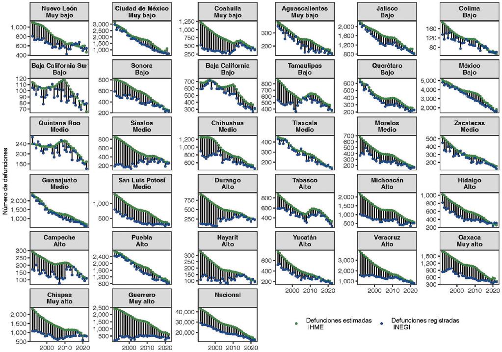 Se realizó un análisis comparativo entre los registros del Instituto Nacional de Estadística y Geografía y las estimaciones del Institute for Health Metrics and Evaluation, elegidas como estándar después de compararlas con otras cuatro fuentes de datos independientes. Las brechas se estratificaron según el índice de marginación para describir la magnitud del subregistro en las entidades federativas.