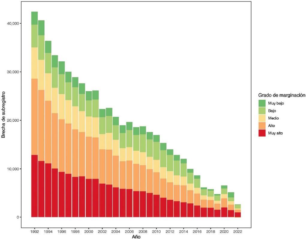 Figura 5 Distribución de la brecha entre defunciones registradas y estimadas de menores de cinco años por grado de marginación de 1992 a 2022. Cada barra representa en números absolutos la diferencia entre defunciones registradas y estimadas. La segmentación por colores permite ver en qué grado de marginación se acumula el subregistro. Fuentes: Instituto Nacional de Estadística, Geografía e Informática (INEGI), estadísticas de defunciones registradas, 1992 a 2022; Institute for Health Metrics and Evaluation (IHME), estimaciones publicadas en 2024; Consejo Nacional de Población (CONAPO), índices de marginación 2020.