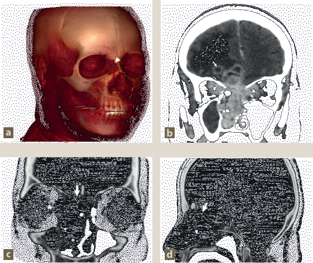Figura 1 Tumor nasal con extensión intracraneal. a) Reconstrucción 3D que muestra pérdida de integridad en el hueso nasal derecho (punta de flecha). b) tomografía computarizada (TC) contrastada en corte coronal, donde se observa el tumor nasal con extensión intraorbitaria (asteriscos) y extensión intracraneal en forma de imágenes quísticas con realce en anillo (flechas delgadas). c) y d) TC con algoritmo óseo en cortes coronal y sagital, respectivamente, evidenciando pérdida de integridad en la lámina cribiforme (flechas gruesas) y en las láminas papiráceas (asteriscos).
