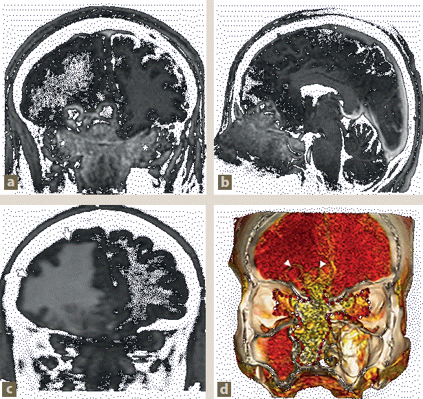 Figura 2 Tumor nasal con extensión intracraneal. a) y b) Resonancia magnética (RM) en T1 + Gd, cortes coronal y sagital, mostrando el tumor nasal con extensión intraorbitaria bilateral (asteriscos) y realce homogéneo intenso, así como extensión intracraneal en forma de imágenes quísticas con realce en anillo (flechas delgadas). c) RM en T2 FLAIR, corte coronal que evidencia un extenso edema vasogénico en el lóbulo frontal derecho (flechas gruesas). d) Reconstrucción 3D del tumor nasal, mostrando extensión intracraneal (cabeza de flecha) y a las fosas nasales (puntos rojos).