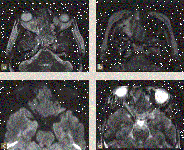 Figura 3 Tumor nasal con extensión intracraneal. a) Resonancia magnética (RM) en T2 axial, que muestra ocupación total de las celdillas etmoidales y senos esfenoidales con alta señal de aspecto heterogéneo (cabeza de flecha). b) RM T2 FLAIR axial, con ocupación total del seno maxilar derecho, que presenta alta señal (asteriscos). c) y d) Difusión y mapas de ADC del tumor nasal con extensión intraorbitaria bilateral (puntos) que muestran restricción a la difusión, secundaria alta proliferación celular.