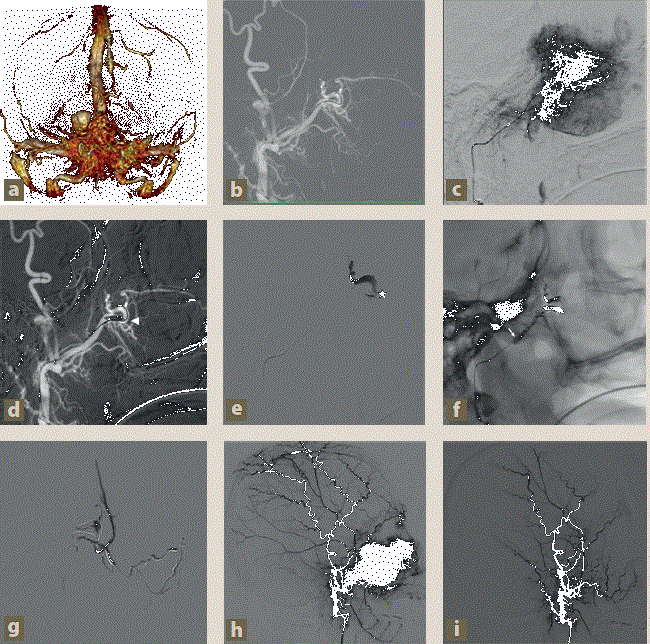 Figura 4 a) Tumor nasal con extensión intracraneal en reconstrucción 3D. b) y c) Angiografía diagnóstica (AX DX) y embolización (técnica olla a presión), posición lateral con road mapping: cateterización de la arteria maxilar interna con extremo distal en la arteria angular, donde se observa “Blush tumoral” y una prominente vascularización en fases arterial temprana y tardía. d), e) y f) Embolización con ascenso de coils (tapón) (puntas de flecha), embolización con Onyx 18 (asteriscos) y mezcla de histoacryl-lipiodol (flechas delgadas). g) Material embolizante con exclusión de la vascularización tumoral. h) Imagen previa a la embolización. i) Imagen posterior a la embolización (control).