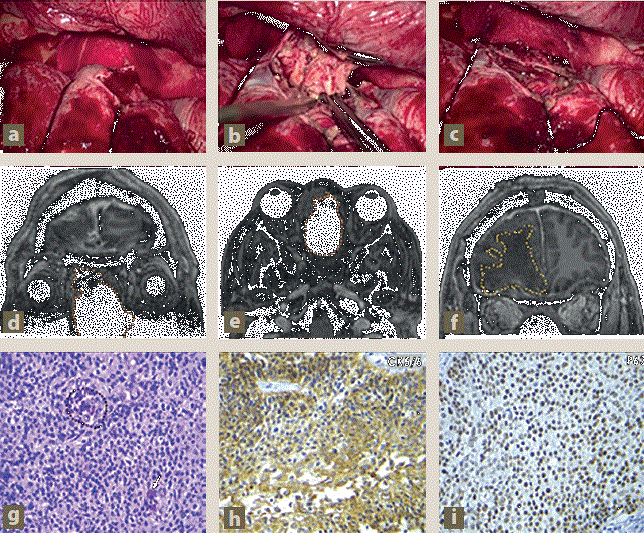 Figura 5 Tumor nasal con extensión intracraneal. Fotografías transoperatorias. a) Apertura de la duramadre en el lóbulo frontal. b) Exéresis de tumor intradural junto a la duramadre. c) Bordes de tejido cerebral sin evidencia de lesión tumoral. Control postquirúrgico por imagen (resonancia magnética [RM] en T1 + Gd en cortes coronal, axial y coronal respectivamente), mostrando: ausencia de la lesión tumoral en las fosas nasales (puntos naranjas continuos), ausencia de la lesión tumoral en la región frontal derecha aunado a edema vasogénico adyacente (puntos amarillos continuos). Imágenes histopatológicas: g) Varias capas de células epiteliales con pleomorfismo nuclear, mitosis (puntos negros) e infiltrado linfocitario (flecha). h) Inmunohistoquímica CK5/6 que confirma el origen epitelial. i) Inmunohistoquímica P63 que confirma el origen epidermoide.