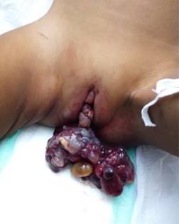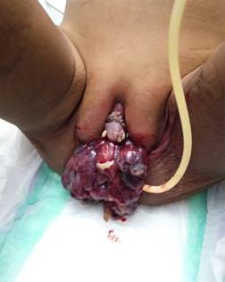 Se solicitó ultrasonido abdominal, en el cual se identificó una masa intravesical hipoecoica con contornos irregulares, que ocasionaba obstrucción de la vía urinaria. Cinco días después, la madre observa una lesión exofítica en región genital de aproximadamente un centímetro de diámetro, color púrpura, la cual protruyó y creció hasta alcanzar de 4 a 5 cm de diámetro (Figuras 1 y 2).