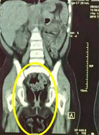 Figura 3: Tomografía simple de abdomen, corte coronal. Se observa masa a nivel vesical, multilobulada con contorno hiperdenso y centro hipodenso múltiples, de aproximadamente 4 × 5 cm.