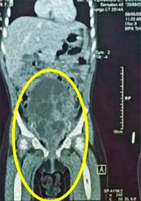 Figura 4: Tomografía simple de abdomen con corte coronal con masa a nivel vesical, pero sin metástasis.