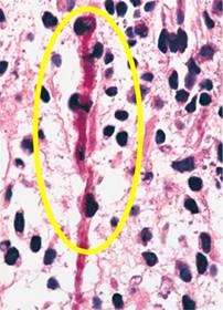 Figura 5: Zonas sólidas con células redondas y fusiformes con núcleos oscuros hipercromáticos con mitosis atípica (rabdomioblastos).