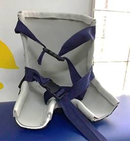 Con el propósito de coadyuvar en las estrategias implementadas de fisioterapia, y a partir de los datos obtenidos de las diferentes escalas, se decidió elaborar un AMPY denominado “activo”, donde el grado de flexión de cadera se encuentra entre los 90o a 95o. Para su confección se utilizaron vendas de yeso, que se moldearon sobre el cuerpo del niño (recubierto por un plástico protector), en posición prona, con flexión de caderas y rodillas, y abducción de miembros inferiores de 30o de cada lado.14 Al finalizar el moldeamiento, se procedió a retirar al niño. Se afinaron pequeños desperfectos y, posteriormente, se colocó al niño en posición sedente para verificar su ajuste. Por último, se dejó secar durante dos días y se forró internamente (área de contacto del niño) con una textura más suave, agregando cintas para sujeción del niño (Figura 1).