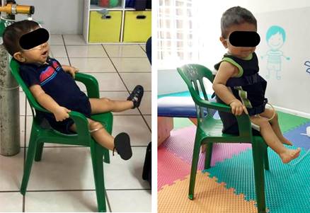 Derivado del retraso global del neurodesarrollo, el paciente inició un programa de fisioterapia a los seis meses de edad corregida. Con respecto a la sedestación, se dan indicaciones para mejorar la alineación del tronco, pelvis y cabeza, así como incrementar la coactivación de la musculatura flexora y extensora del tronco, para que los miembros superiores no formen parte del sistema de equilibrio y propiciar la función e interacción con el entorno.