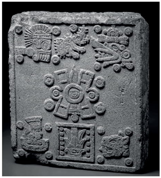 Así pues, éstos son los mismos elementos que se observan en la Piedra del Sol, con la diferencia de que no se encuentra la fecha 1-cipactli, sino los 20 signos y el cartucho de xihuitl, “año”, con la fecha 13-acatl (figura 2).