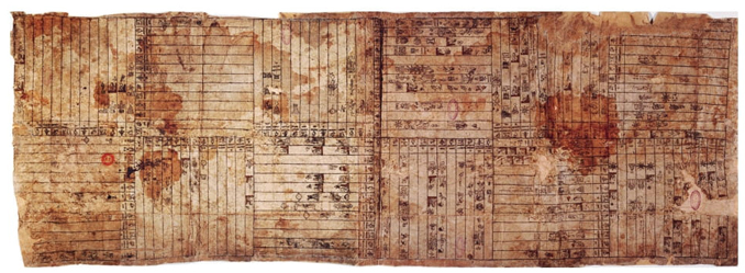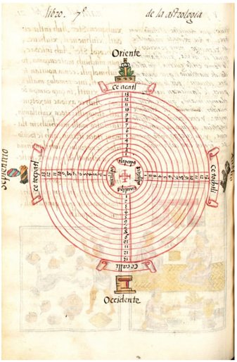 Es la primera cuenta la división del año por sus meses. Es el caso que ellos repartían el año en deciocho partes, y a cada parte le daban veinte días. La segunda cuenta que estos naturales usaban se llama cuenta de los años, porque contaban cierto número de años por la forma que se sigue: tenían cuatro caracteres. La tercera cuenta que estos naturales usaban era el arte para adivinar la fortuna… (Sahagún 1989, 1: 275-276).