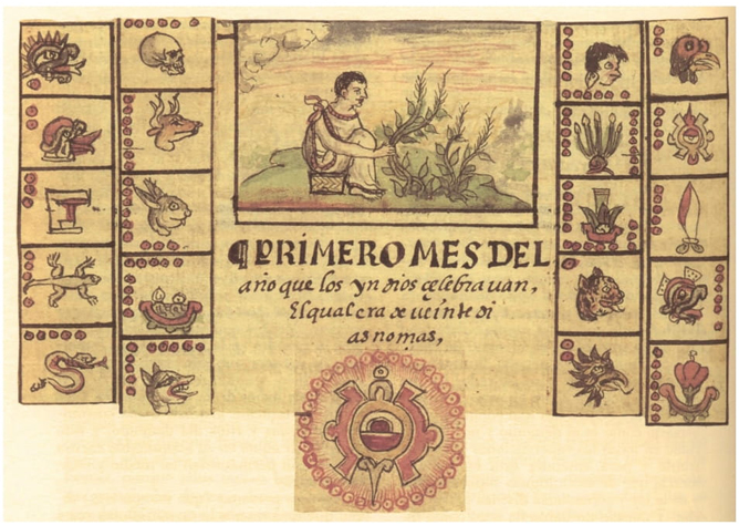 Según la pintura, que es un indio con un ramo en la mano, parece que nos quiere significar la segunda declaración del vocablo, que es tener un ramo en la mano. Pero considerado, como ellos lo consideraban, que el año era de muchos meses y días, compuesto como el ramo de muchas ramas y hojas, propiamente, aunque por metáfora, quiere decir “tomar el año en la mano”, empezar el año, como acá decimos: “Tomé el camino en la mano”, para dar a entender que empezó el camino. Así estos, por metáfora, daban a entender ser el principio del año y tomar y empezar a correr su año. Y esto era el primer nombre que año nuevo tenía (Durán 1967, 1: 239-240).