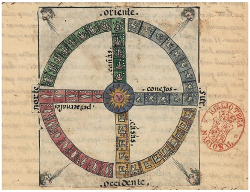 También encontramos otros documentos que muestran una división del tiempo en cuatro conjuntos de 13 años que tienen el mismo signo en común. Así, se agrupan todos los años acatl, seguidos de los tecpatl, calli y tochtli. Esta disposición permite asociar cada trece años con un color y una dirección, lo que puede observarse en el Códice Tovar, el Códice florentino y el Códice Durán (figuras 9 y 10).