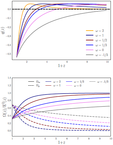 Figure 1 showcases the deceleration parameter q(z) and the density fractions Ω/E 2(z) of both matter and scalar field ϕ as a function of redshift. Following results from the latest surveys, the x-axis is displayed up to z ≈ 9 since very few galaxies had been formed before that redshift. An additional assumption has been made here: that the cosmic fluid always has an equation of state that follows the condition ω > −1/3 to satisfy the weak energy condition. We study cases such as the pure-radiation fluid in navy blue (ω = 1/3), matter-only in pink (ω = 0), or the adiabatic limit (ω = − 1/3) for which the weak energy condition holds.