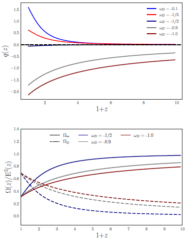 The bottom panel of Figure 3 shows the evolution of the density fraction only for the values of ω D that lead to an accelerated expansion of the Universe, i.e., equations of state that are smaller than −1/2.