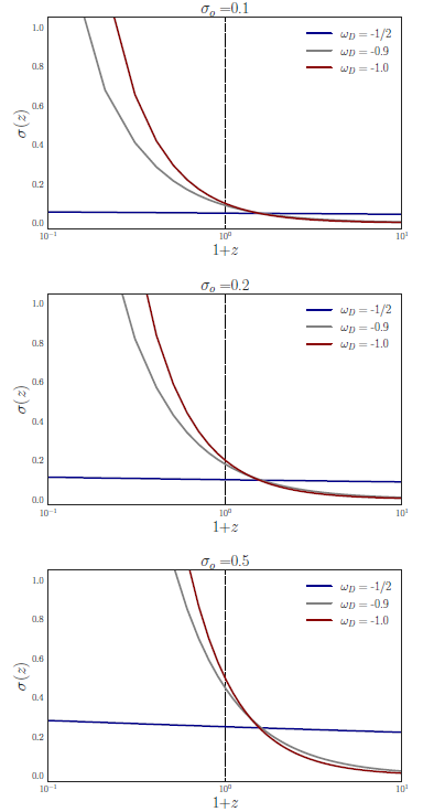 • Constant σ: the solutions of the differential equations are quadratic in redshift and exhibit trends similar to the scalar field density fraction. However, as expected, the expressions found for σ o and ω D differ from the results presented in § 3.