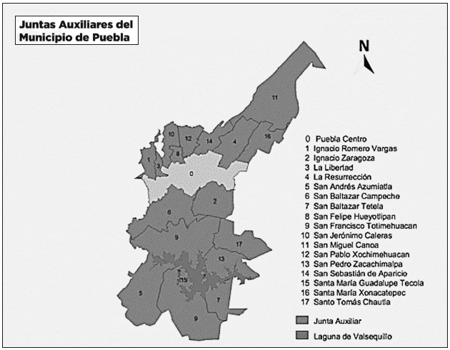 Figura 1 Municipio de Puebla. Distribución de la cabecera (Puebla Centro) y juntas auxiliares