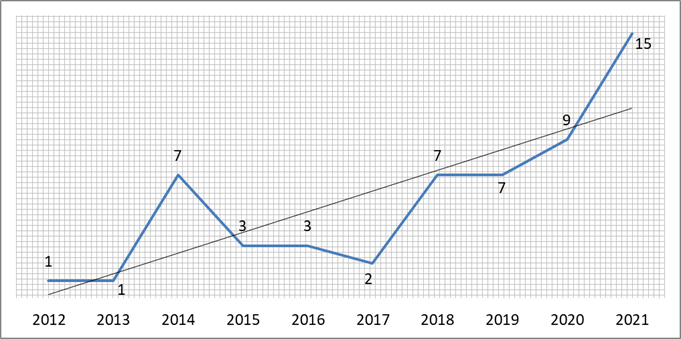 Nuestra revisión de la literatura identifica la primera publicación QCA en AL que utiliza la técnica hasta la minimización booleana en el año de 2012. A partir de entonces, la frecuencia de las publicaciones ha incrementado exponencialmente, alcanzando su punto más alto en el primer semestre del año de 2021.