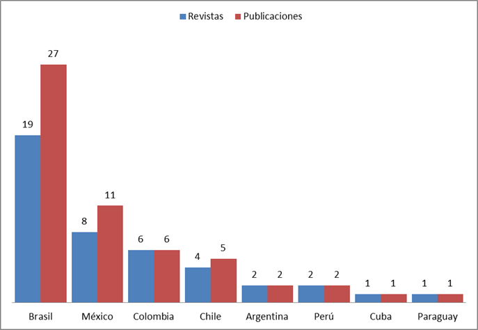 Al respecto, la Gráfica 2 expone que los estudios revisados están publicados en 43 revistas, editadas en 8 países, principalmente en Brasil y México, entre las que se encuentran algunas de las más prestigiosas de la región, como Perfiles Latinoamericanos de la Facultad Latinoamericana de Ciencias Sociales, Política y Gobierno del Centro de Investigación y Docencia Económicas, Revista Mexicana de Ciencias Políticas y Sociales de la Universidad Nacional Autónoma de México o la Brazilian Political Science Review de la Asociación Brasileña de Ciencia Política.