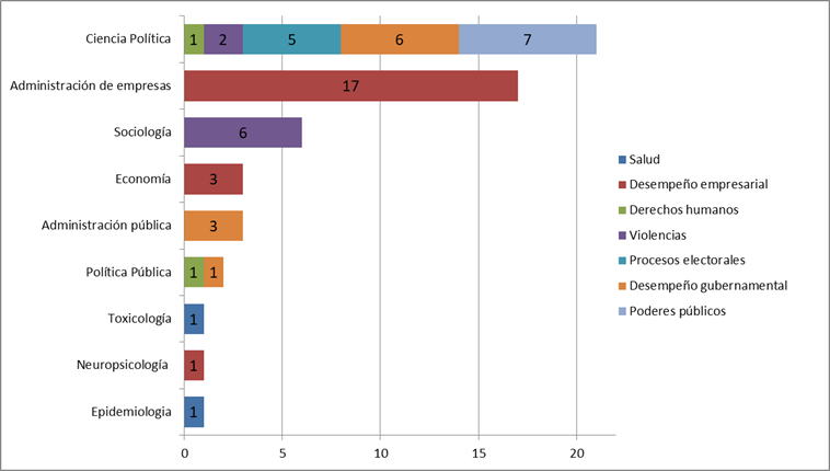 Con referencia a lo anterior, el estudio de la causalidad múltiple en AL se ha extendido más allá de las ciencias sociales, encontrando aplicaciones en disciplinas como la toxicología, epidemiologia o la neuropsicología. De acuerdo con el marco teórico, entre los estudios QCA revisados identificamos nueve campos disciplinarios, en donde la ciencia política es el más recurrente, así como siete áreas temáticas de acuerdo con el objeto de estudio: