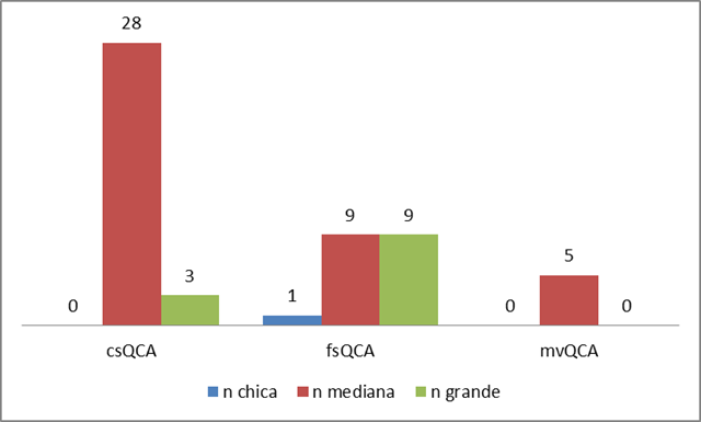 El diseño metodológico también es diverso. El estudio de la causalidad múltiple se extiende a situaciones con una n grande (más de 50 casos) y las relaciones entre los conjuntos comienzan a problematizarse también desde una perspectiva no dicotómica, aunque las aplicaciones CSQCA son las más frecuentes, como en otras regiones del mundo (Rihoux, 2013). Lo anterior se explica, en parte, por el desconocimiento de la técnica: conjuntos dicotómicos aparentemente es la variante más sencilla; por dicho motivo, probablemente, encontramos aplicaciones para resultados que no se prestan para la dicotomización.