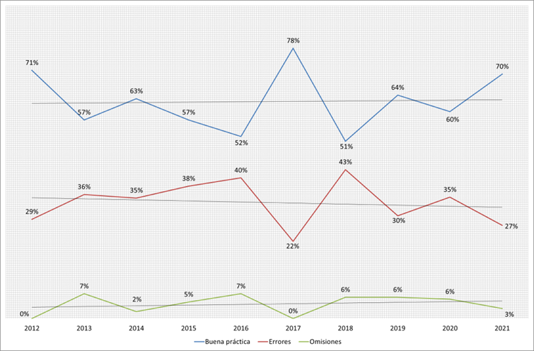 Gráfica 5 Evolución de buenas prácticas, errores y omisiones en estudios QCA en América Latina, 2012-2021.