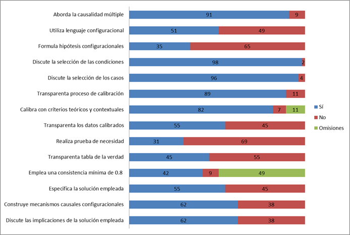 En términos particulares, es preciso decir que existen claroscuros en la aplicación de QCA. En la Gráfica 5 puede observarse que la mayor parte de la literatura consultada respeta buenas prácticas: como usar QCA para abordar la causalidad múltiple, discutir la selección de las condiciones explicativas, problematizar la selección de los casos, transparentar el proceso de calibración y asignar umbrales de pertenencia con base en conocimientos teóricos o contextuales. Empero, en otros rubros predominan malas prácticas y omisiones.