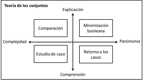 A diferencia de otras aproximaciones metodológicas en las ciencias sociales, el análisis cualitativo comparado o QCA, por sus siglas en inglés, desarrollado por Ragin (1987), permite identificar las condiciones individualmente necesarias y las configuraciones causales suficientes para la presencia o ausencia de un resultado en casos similares, centrándose en las relaciones asimétricas entre los conjuntos teóricos (Ragin, 1987, 2013; Rihoux y Ragin, 2009; Rihoux y Lobe, 2009; Pérez, 2007, 2010). En este orden de ideas, QCA parte de una postura mecanística de la causalidad (Beach y Pedersen, 2013; Mahoney y Goertz, 2006) ubicándose epistemológicamente “dentro del paradigma pragmatista, entre las posturas postpositivistas y constructivistas” (Ariza y Gandini, 2010: 502), alineándose con la corriente metodológica dura-blanda en las ciencias políticas (Almond, 2001).