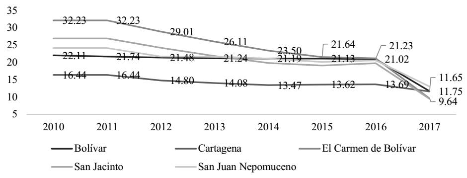De 2010 a 2017, la Gráfica 1 muestra la disminución agregada de la tasa de mortalidad infantil en los municipios de estudio contrastándola con la tasa departamental y la de su capital. A pesar de ello, estos municipios se encuentran más rezagados que Cartagena y que el mismo departamento, siendo El Carmen de Bolívar el que más mortalidad presenta. No obstante, a 2017 la disminución de esos municipios fue relativamente mayor en proporción frente a años anteriores.