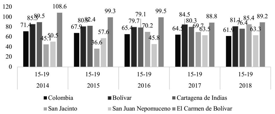 Por otra parte, se realizó una caracterización de algunos indicadores trazadores de infancia y adolescencia con el fin de observar el avance en la gestión realizada en estos municipios. Los resultados fueron comparados con la capital del departamento de Bolívar (Cartagena), el mismo departamento y datos a nivel país. La tasa de embarazo en población adolescente fue estimada de la siguiente manera: Nacidos vivos + Defunciones fetales/Población del municipio x 1.000.