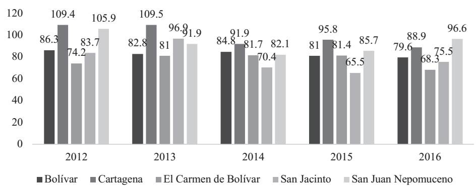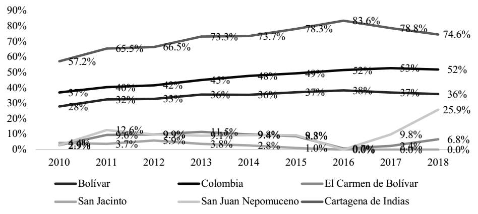 La Gráfica 4 muestra en los últimos ocho años el rezago que tienen estas poblaciones frente al departamento, y sobre todo frente a la capital Cartagena, siendo preocupante la situación sobre todo de San Jacinto que es el municipio más rezagado de los tres. De San Juan Nepomuceno se resalta el repunte que tuvo en el año 2018, representando la mayor proporción de cobertura de los municipios de estudio durante todo el periodo analizado.