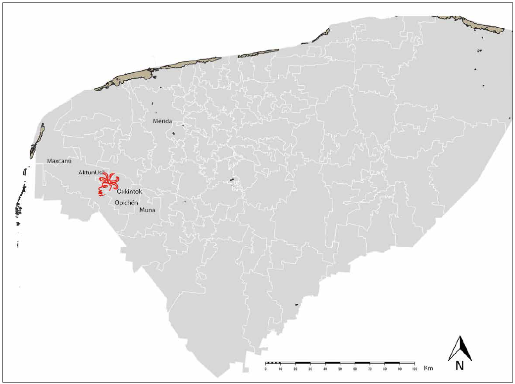 Aktun Usil se localiza en la región del Puuc en Yucatán y actualmente pertenece al municipio de Maxcanú (Figura 1). Esta cueva ha sido tema de estudio desde 2005 por parte de Eunice Uc y Alfredo Barrera, quienes sugirieron la relación de las pinturas con los puntos cardinales y el uso del sitio para el estudio astronómico. Asimismo, señalaron su utilidad en la elaboración de calendarios asociados con eventos significativos y con periodos tanto de siembra como de cultivo (Mixon, 2010: 31).