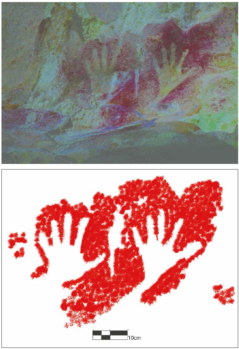 Figura 10 Manos pintadas al negativo en color rojo. Aktun Usil, Maxcanú, Yucatán