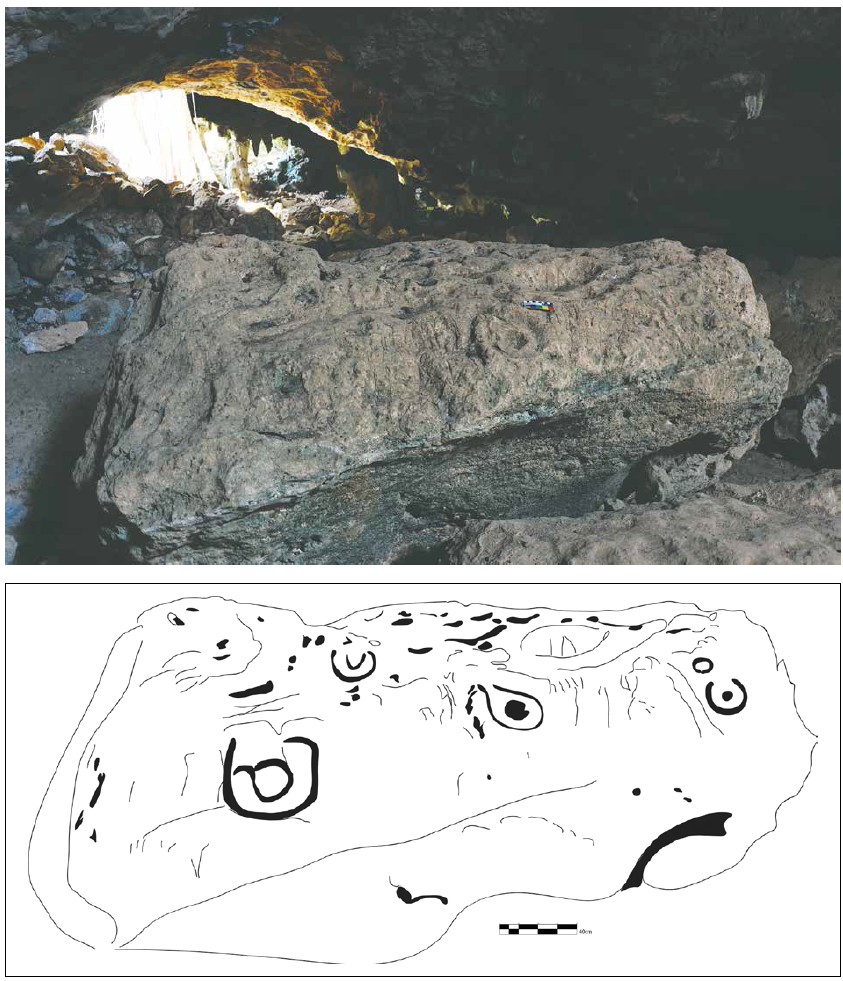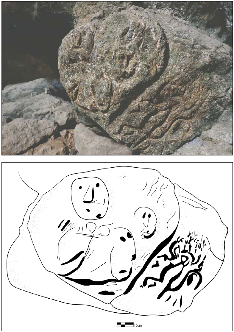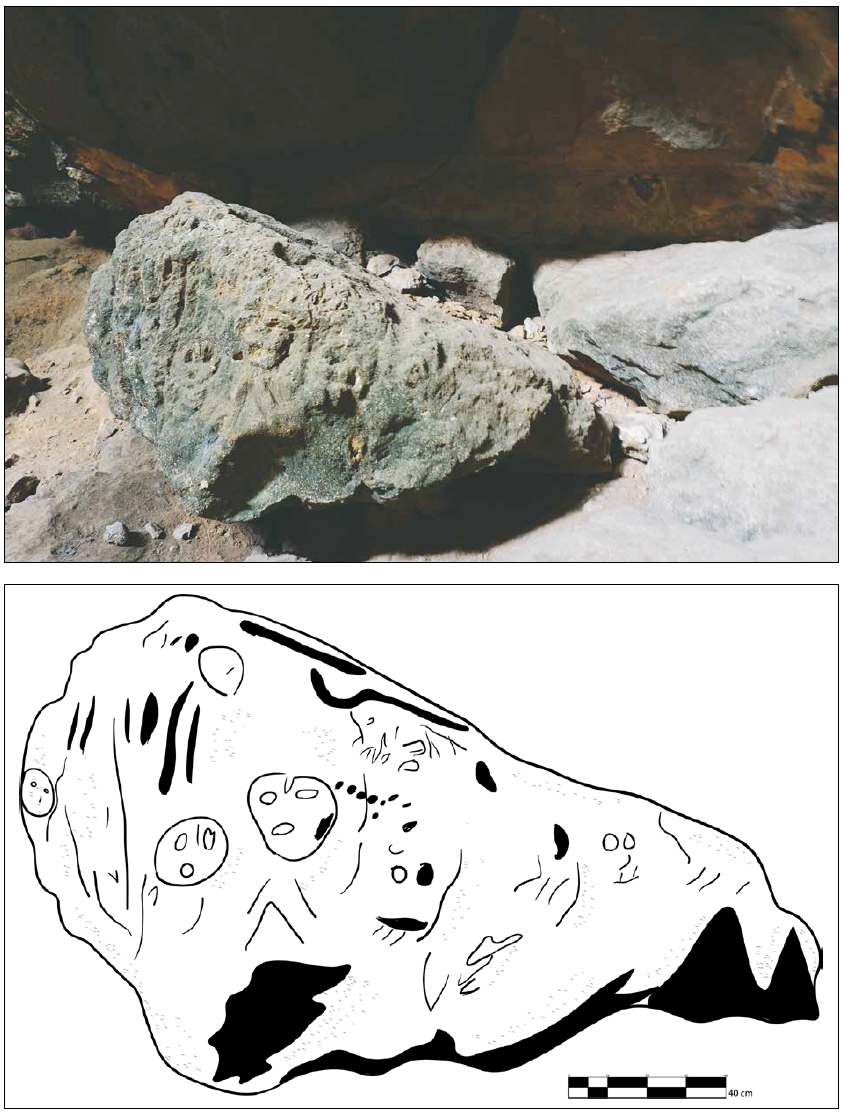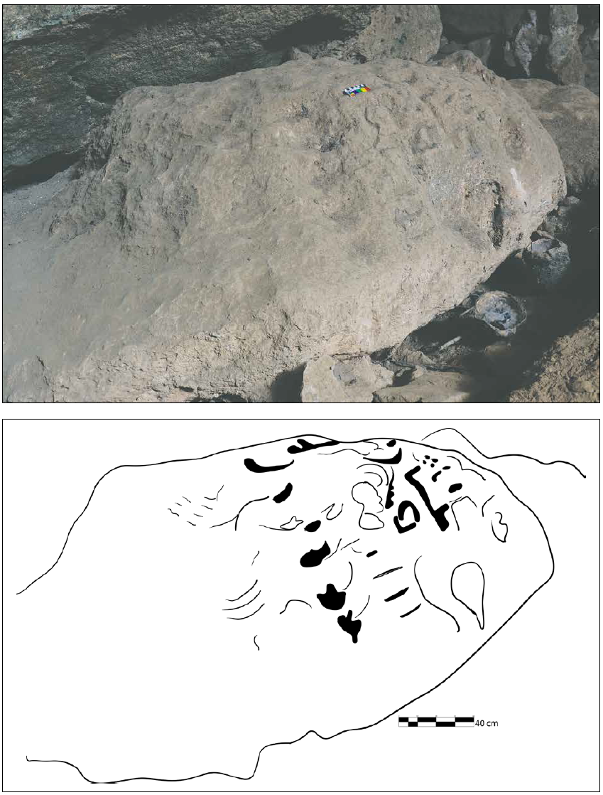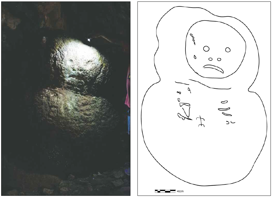 Además de las pinturas, en la primera cámara existen dos grabados. El primero se encuentra al noroeste de las pinturas, en una roca exenta que fue aprovechada para formar una escultura de bulto. El cuerpo redondeado presenta distintos grabados, algunos de ellos similares a vulvas o pezuñas de venado, así como un lacértido. En la parte superior, tiene un rostro esquemático del que destacan las cuencas de los ojos en forma almendrada. Un par de círculos marcan las fosas nasales y la región de los labios, cuya comisura va hacia abajo. La imagen nos recuerda a los rasgos félidos característicos de las llamadas “caritas estilo baby face” de la iconografía olmeca. Posiblemente, estemos en presencia de uno de los wahyis del sitio, un ancestro que resguarda aquel espacio (Velásquez, 2013: 568; Martos, 2015: 260).