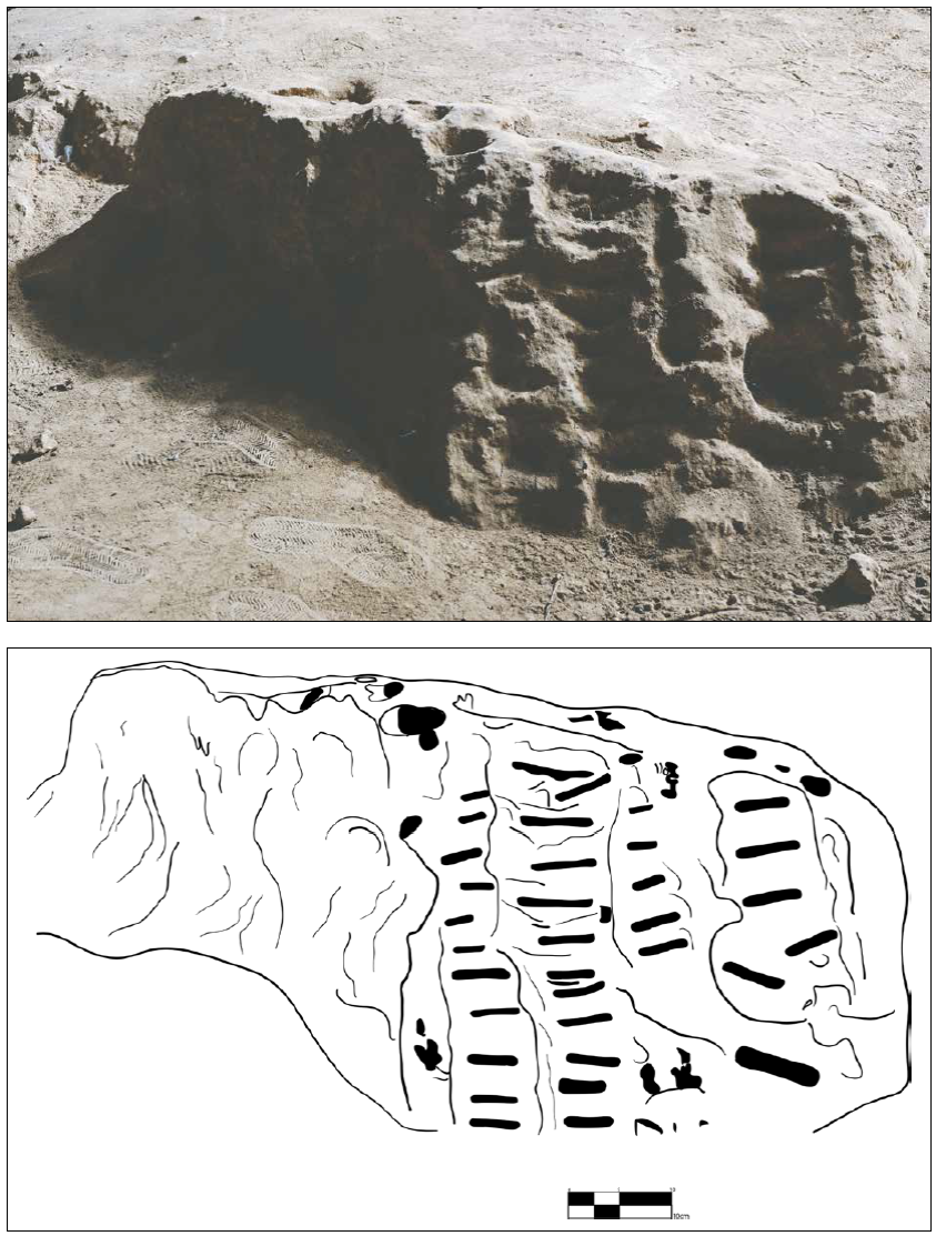 Una vez que se ingresa a la segunda cámara, encontraremos dos grandes rocas exentas que han sido labradas en tres de sus caras. En la primera destacan líneas, círculos, elementos geométricos y una figura semicircular que puede ser la representación de una vulva, así como una serie de pocitas en la parte superior de la roca y al menos tres escalinatas labradas (Figura 11).