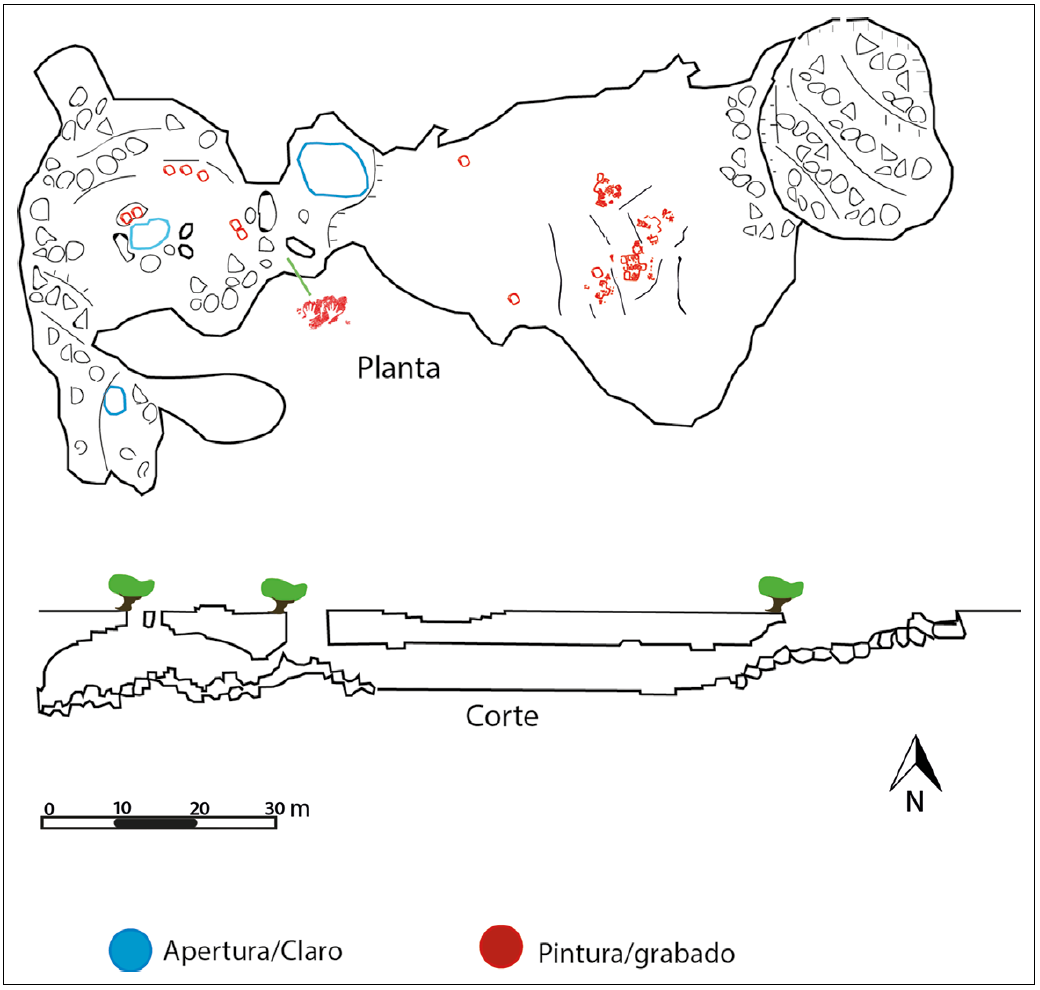 La cueva se ubica a menos de dos kilómetros del sitio arqueológico de Oxkintok, al occidente. Esto nos lleva a sugerir posibles vínculos con aquel lugar, tanto simbólicos como iconográficos, particularmente con la estructura de Satunsaat (Rivera, 1986: 87-108; 1996: 60). La cueva tiene tres cámaras en su interior. La primera de ellas con una gran entrada de más de veinte metros de altura que, junto con una claraboya al otro lado de la cámara, permiten una tenue pero constante iluminación. El techo es el soporte de las pinturas, acompañadas por un par de grabados en rocas exentas a ras de suelo, así como por dos manos pintadas al negativo en un dintel formado por las rocas del pasillo que comunica con la segunda cámara, la cual se ilumina a través de algunas filtraciones de luz que atraviesan los resquicios de la bóveda parcialmente colapsada. En esta segunda cámara hay grabados en cinco rocas exentas, al igual que en uno de los muros que la delimita. La tercera cámara carece de iluminación natural y hasta el momento no se ha encontrado arte rupestre en su interior (Figura 2).